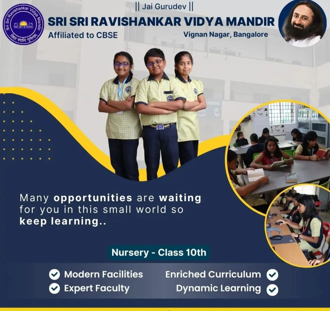 Sri Sri Ravishankar Vidya Mandir, Brindavan Estate, Behind Jain Heights, Vignan Nagar, Bengaluru 560 037, Karnataka, India.